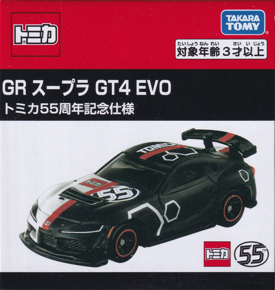 | 備考 | 「トミカ55周年自動車メーカーコラボプロジェクト」始動! 「GR スープラ GT4 EVO トミカ55周年記念仕様」が登場! 「トミカ55周年自動車メーカーコラボプロジェクト」とは、トヨタ自動車株式会社、日産自動車株式会社、株式会社本田技術研究所、三菱自動車工業株式会社、スズキ株式会社の自動車メーカー5社にご協力いただき、普段は実車のデザインを担当している各社のデザイナーに「トミカ」のためだけの特別な55周年デザインを考えていただく夢の企画です。 「トミカ」の中でも人気の高い車両に合うデザインを各社の社内コンペで決定していただきました。それぞれのデザインで装飾された実車両も様々なイベントで登場予定です。 |